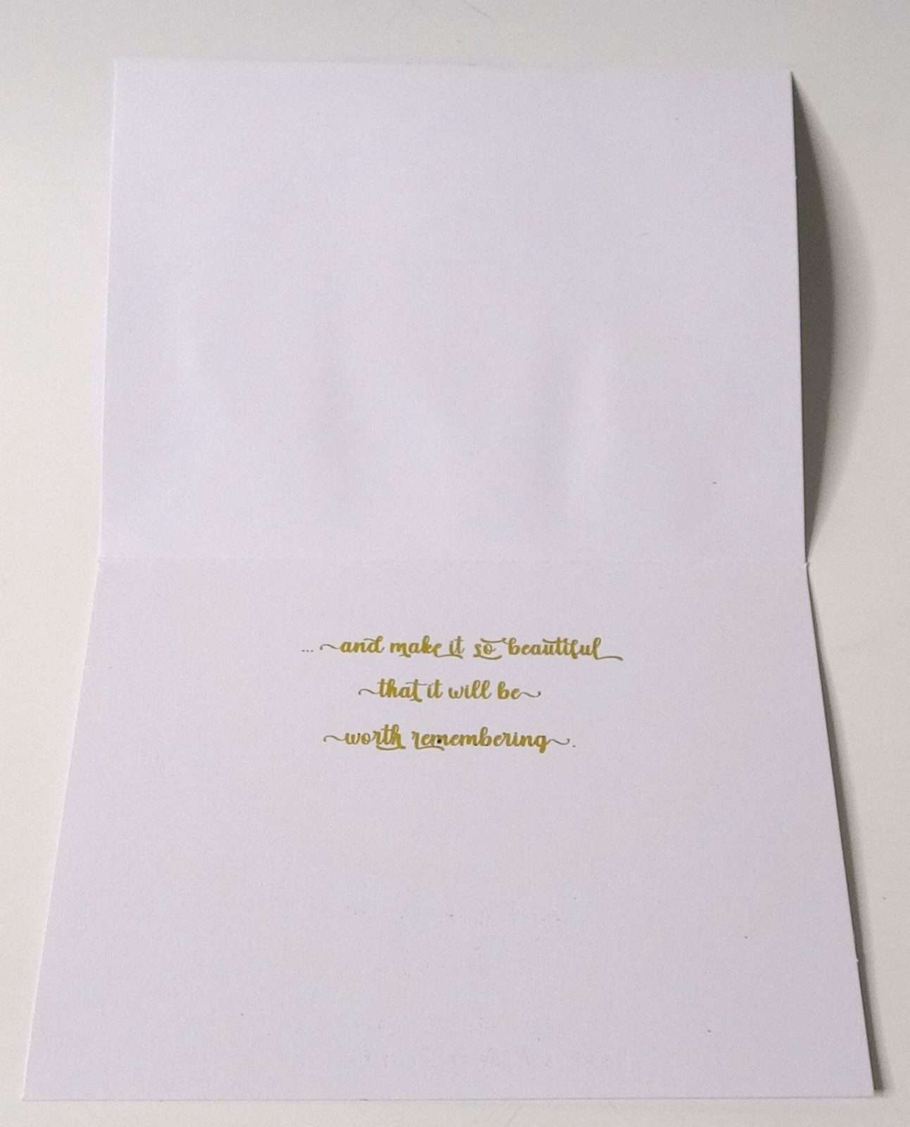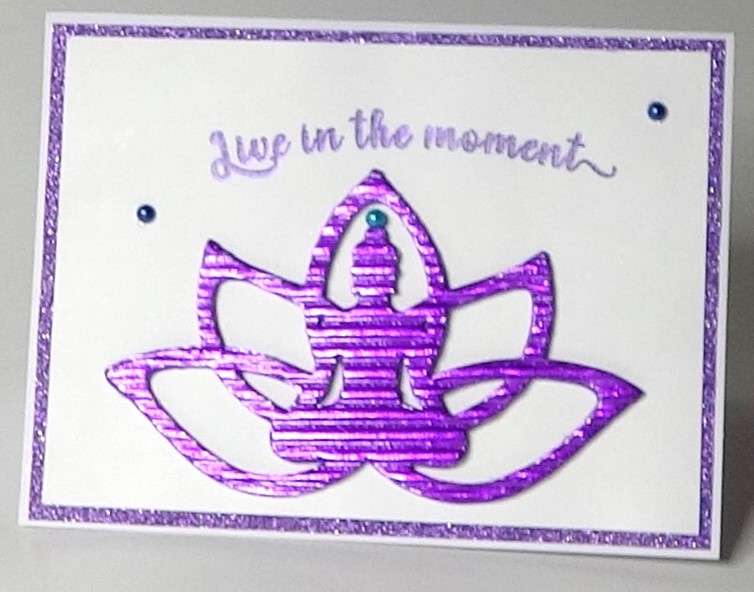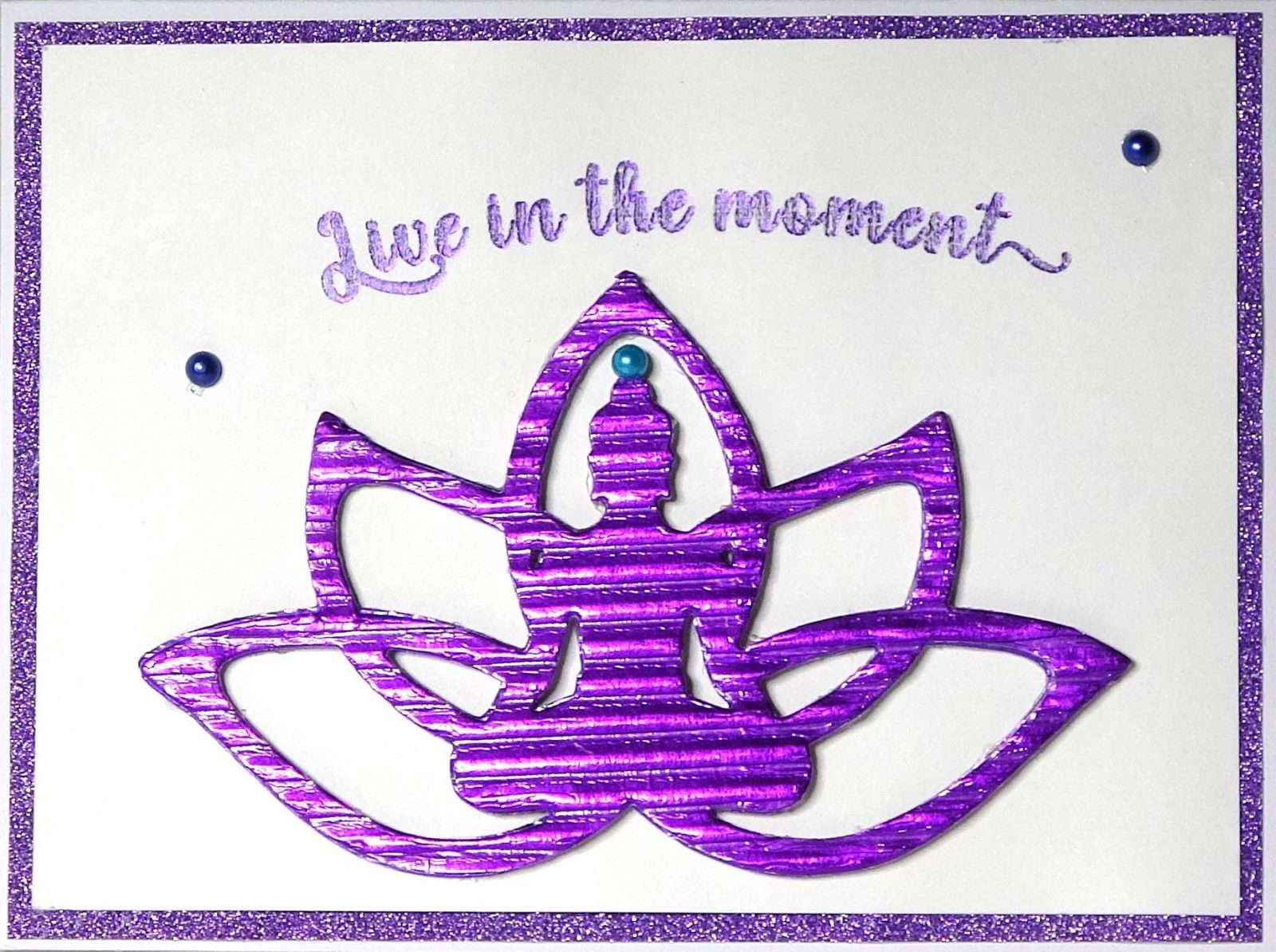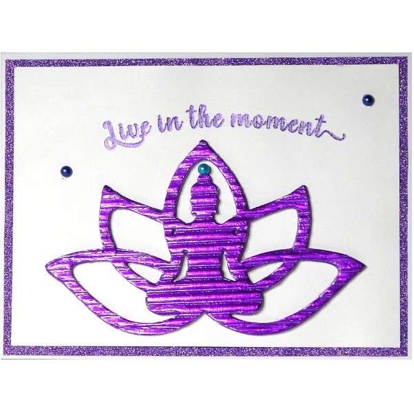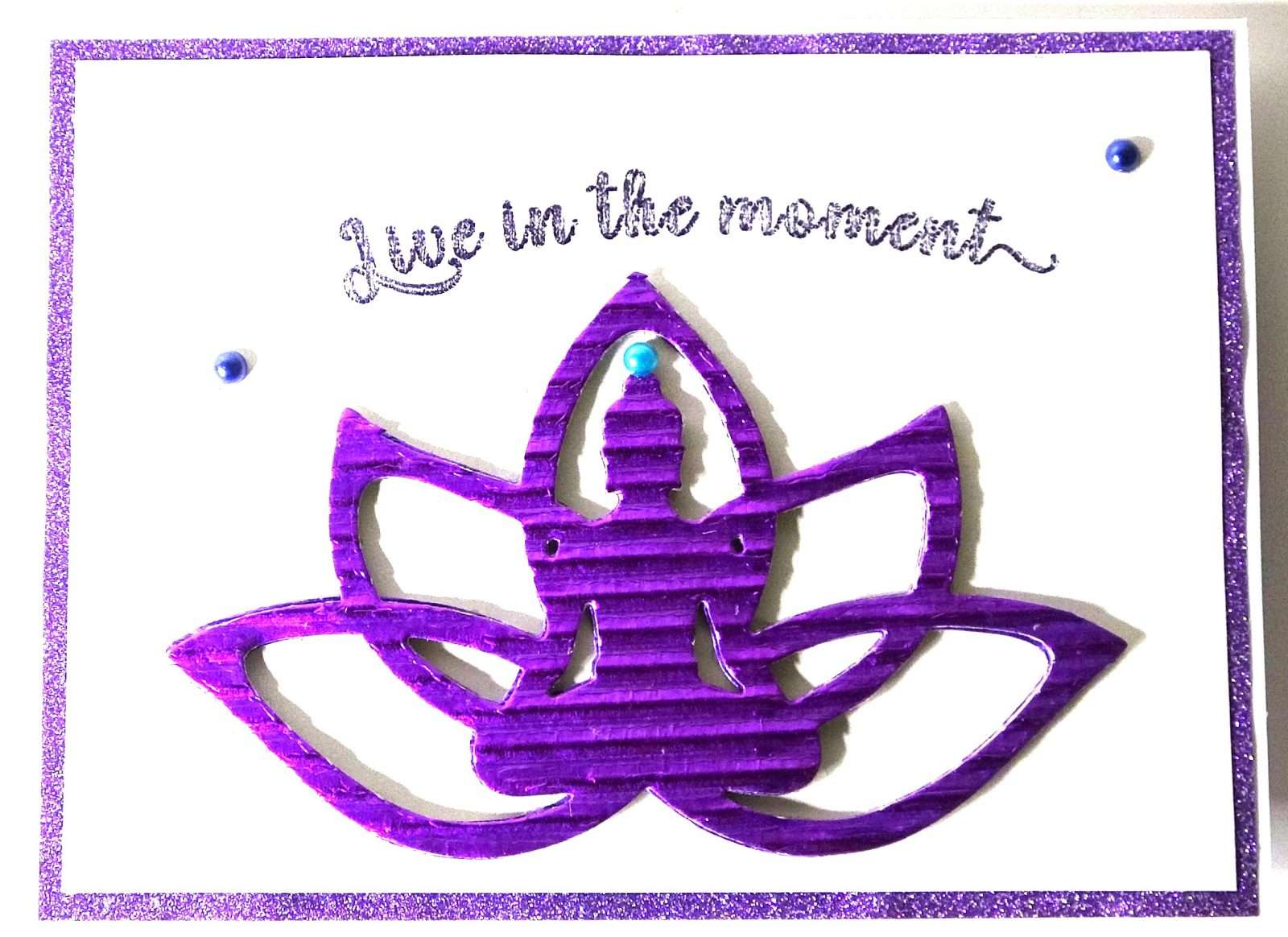 The card is made of white cardboard and finished with gold foil inside. A cut lotus flower within Sukhasana pose makes the front of the card with the theme “Live in the moment”. The golden message inside is: