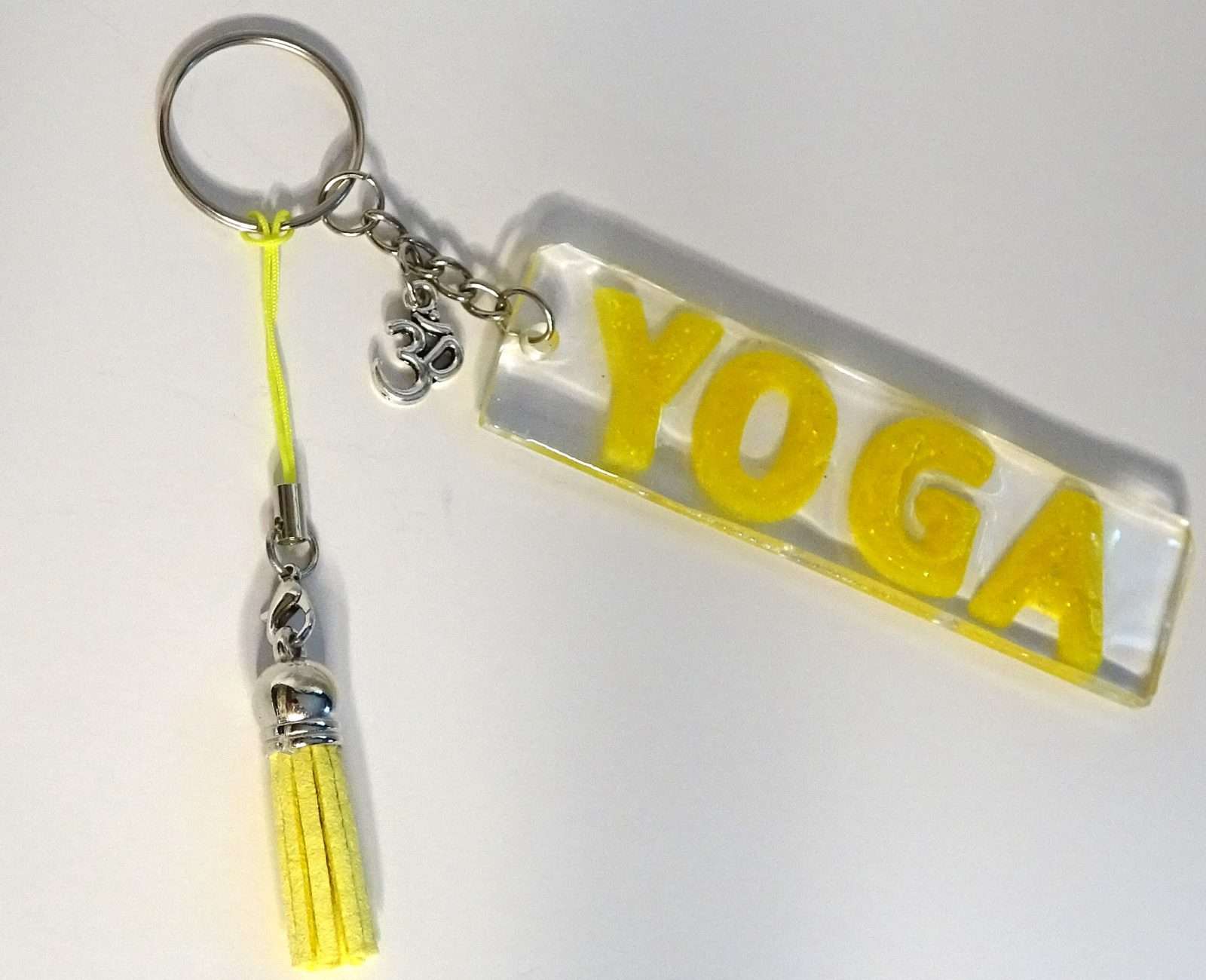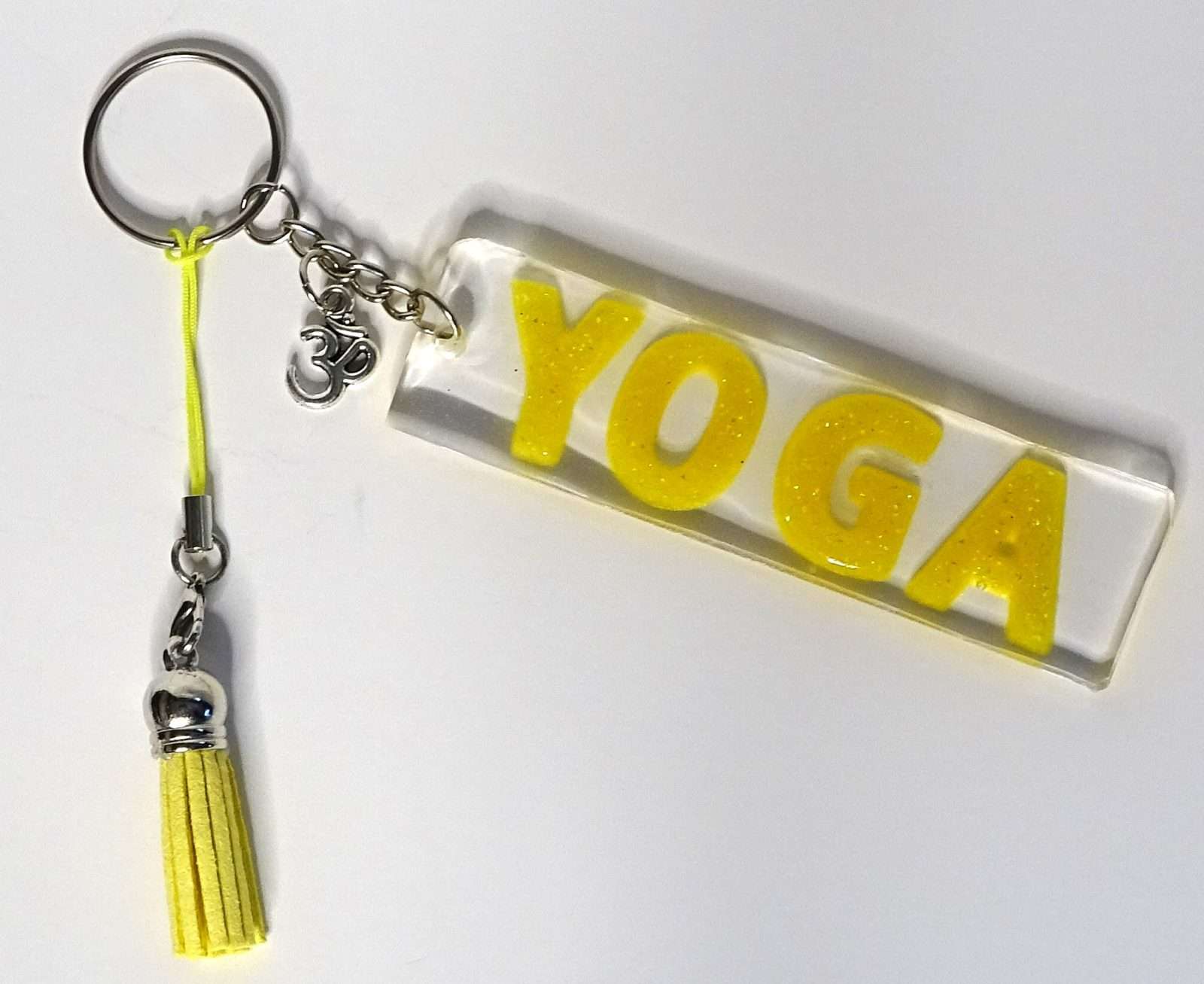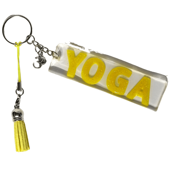 Resin “YOGA” keychain is made with resin dye, glitters, and acrylic paint 3.75″x1″.