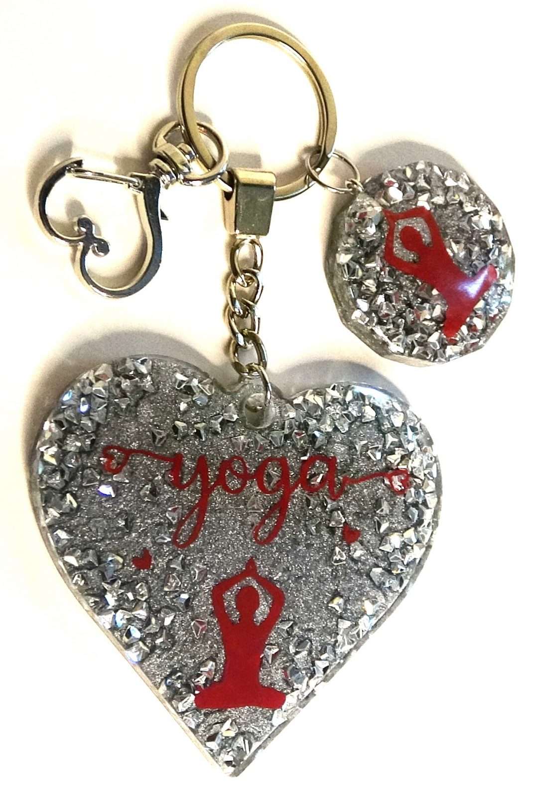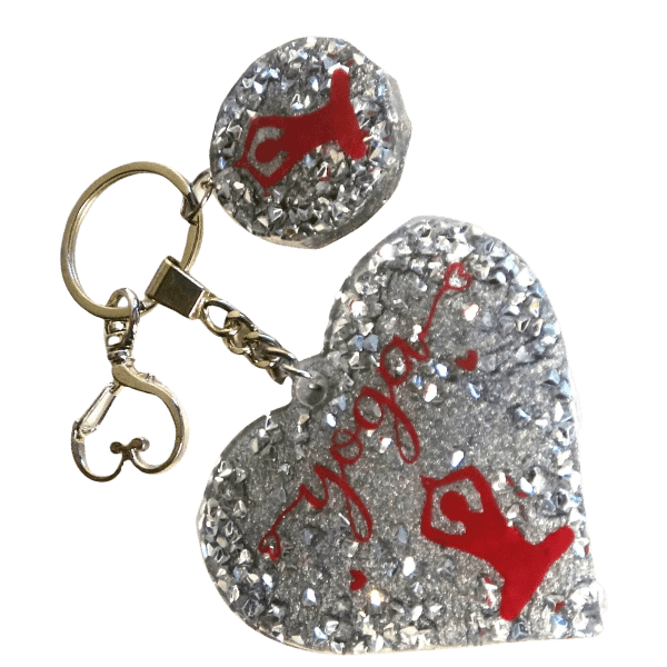 Handmade of epoxy resin, resin dye, and a glitters Heart pendant with YOGA word and meditation stickers, a silver keychain, a pendant with a meditation sticker, and a heart silver clip.