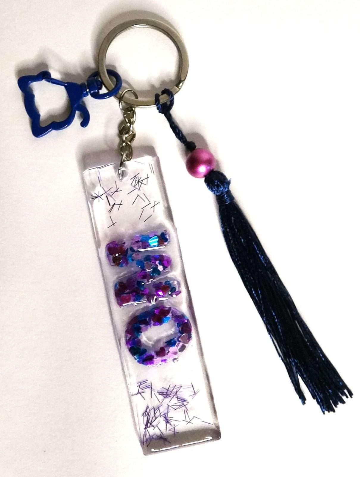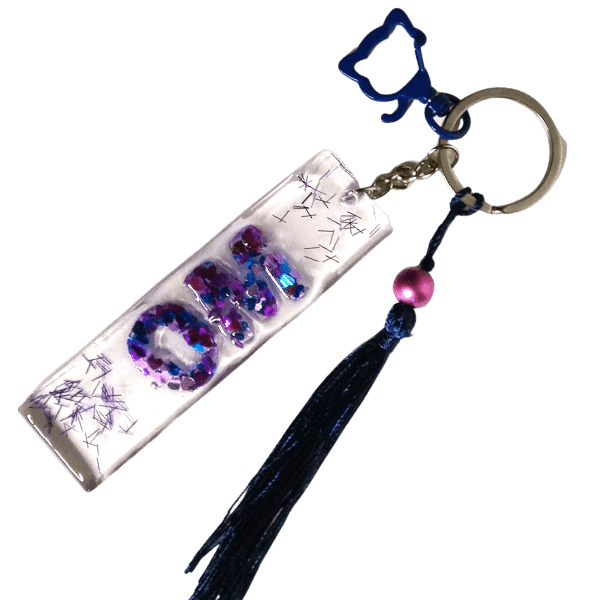 Resin “OM” keychain is made with resin dye, glitters, and acrylic paint 3.75″x1″.