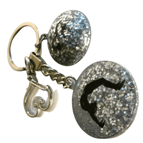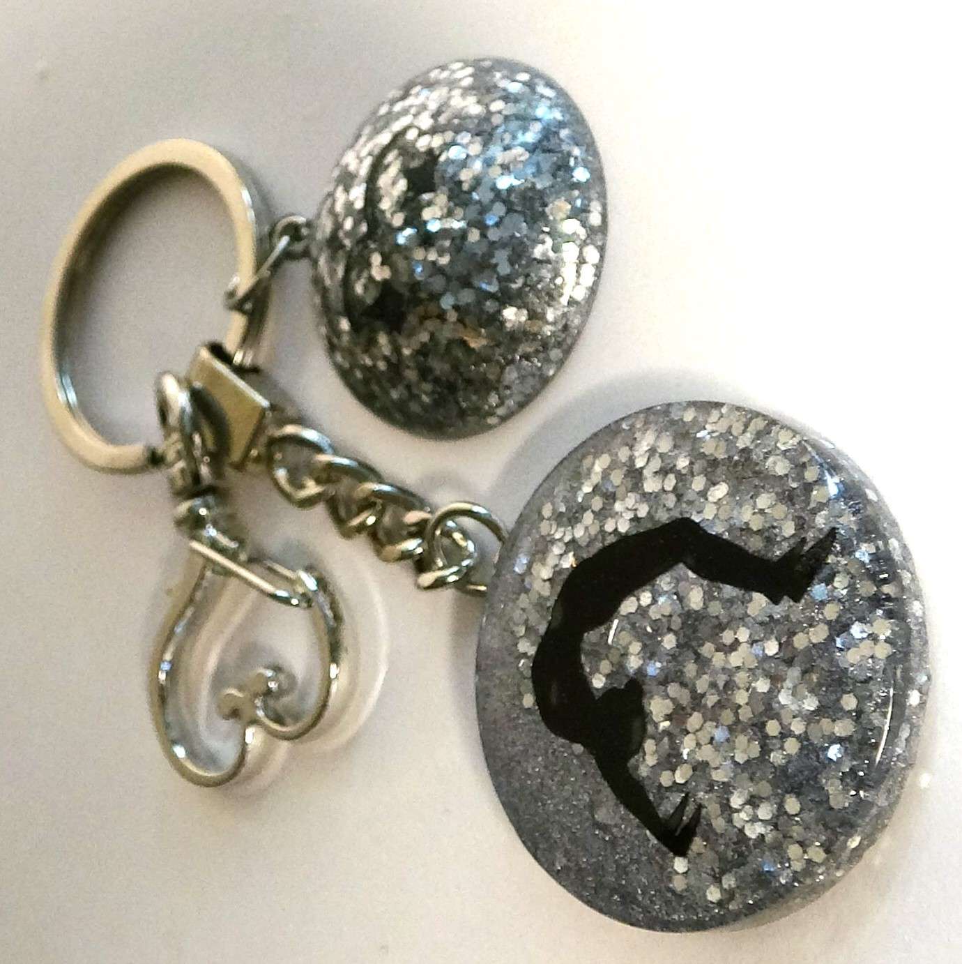 Wheel yoga pose (Upward-Facing Bow Pose) sticker in a round handmade epoxy resin keychain with an assorted pendant. and a heart clip.