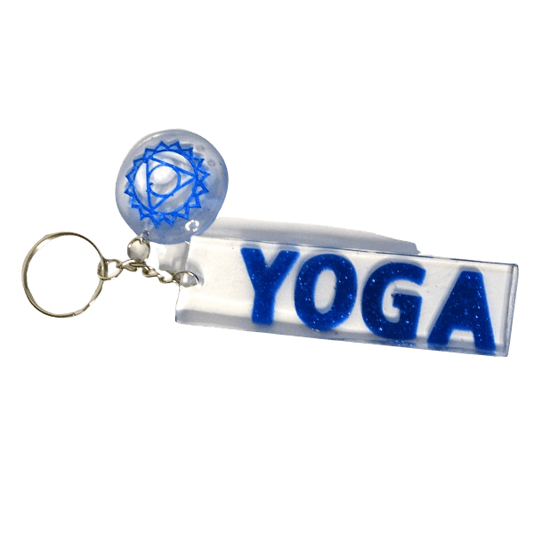 YOGA word clear rectangular epoxy resin keychain with the Throat chakra.